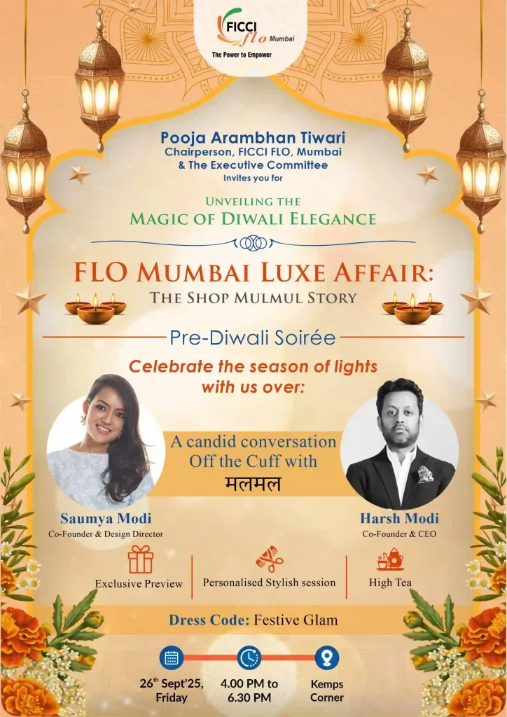 Mumbai FLO FLO Mumbai Luxe Affair – The Shop MulMul Story 26 September 2025 3 PM to 5 PM The MulMul Shop , Kemps Corner , Mumbai Harsh Modi , Co Founder and CEO and Saumya Modi, Co Founder and Design Director