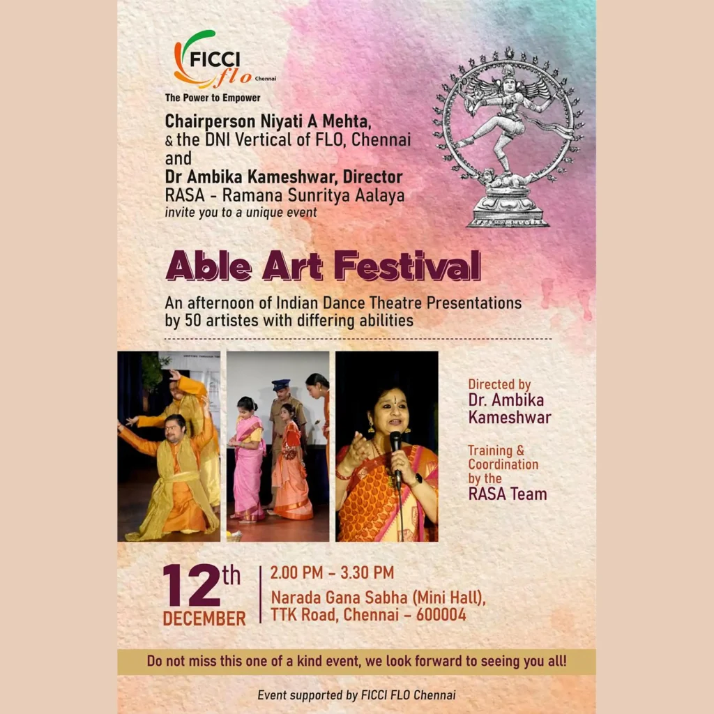 Chennai FLO Able Art Festival 12, December 2.00 PM-3.30 PM Narada Gana Sabha (Mini Hall), TTK Road, Chennai – 600004