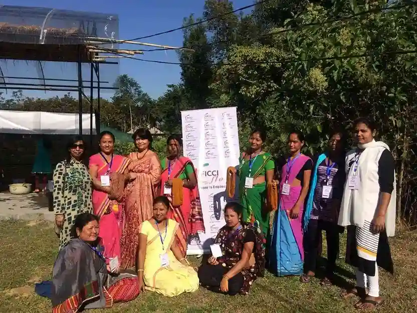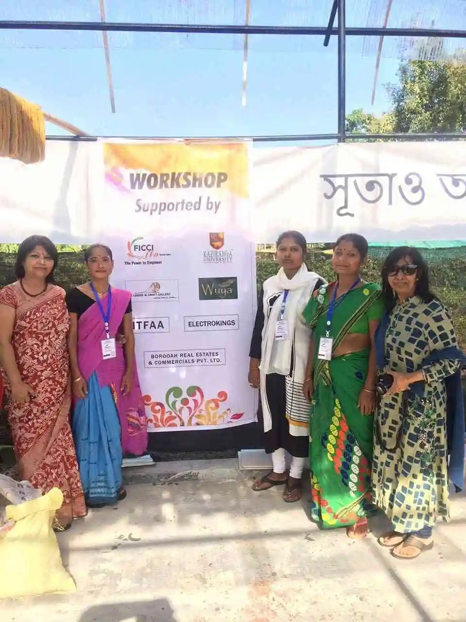 A workshop of Natural Dye on Eri held in Kazirangaæ from 1st of December 2017. The workshop was for 10 days and FICCI FLO North East Chapteræ sponsored the course for 10 girls. All the girls are weavers of eri fabric and participation in this workshop will help them to dye their own threads or fabric. The dyes used are purely natural and organic and readily available in the woods of Kaziranga. Henna, turmeric, hibiscus, jasmine, onion peels, indigo, powder puffs etc are some of the readily available sources.