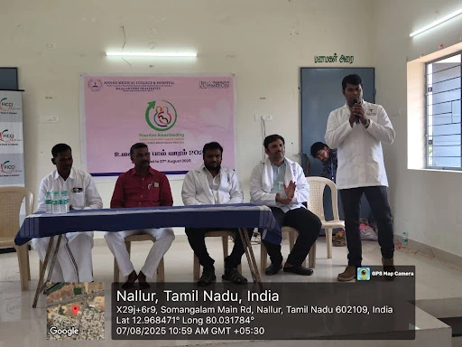 Dr. Sivagurunathan, Head of the Department of Community Medicine, delivered a detailed and compelling address on the benefits of exclusive breastfeeding for the first six months. He spoke on its critical role in reducing neonatal and infant mortality rates and highlighted the risks associated with bottle feeding and inappropriate weaning practices. His talk was followed by a short but impactful address by the Panchayat President, who appreciated the initiative and urged the community to actively engage in maternal and child health programs.