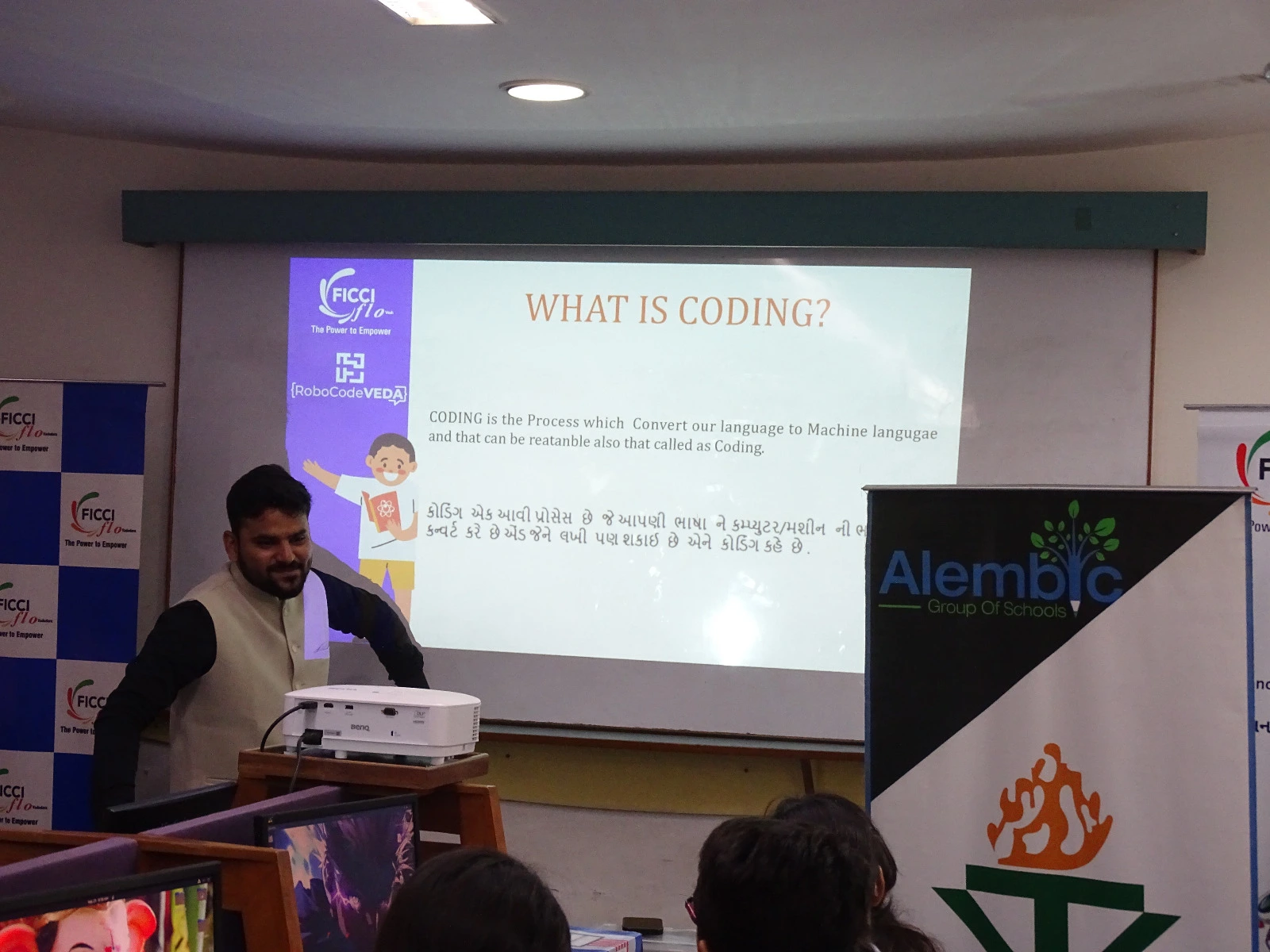 The workshop began with a welcome and introduction of FICCI FLO and RoboCodeVeda, along with a discussion on the importance of coding. Students were then introduced to the VizBloc platform, learning how to navigate the block-based coding software. They started with a simple “Hello Animation” project, creating animations with character movement, speech bubbles, and background changes.