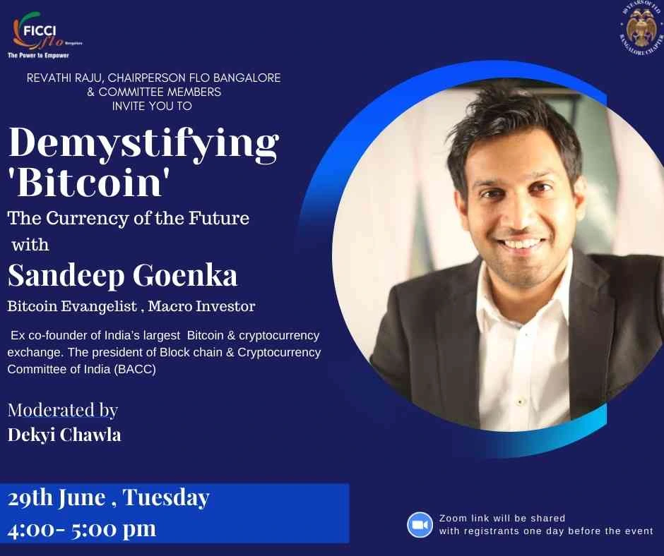Speaker – Sandeep Goenka, Ex-Co-Founder of India’s Largest Bitcoin and Cryptocurrency ExchangeTime – 4pmContact Person – flo@ficci.com