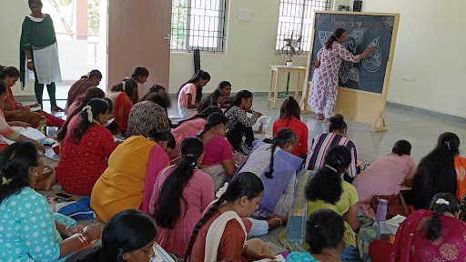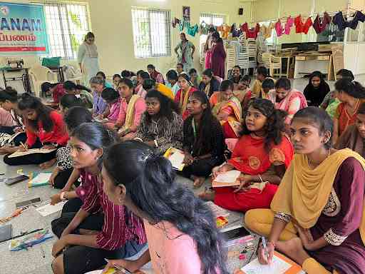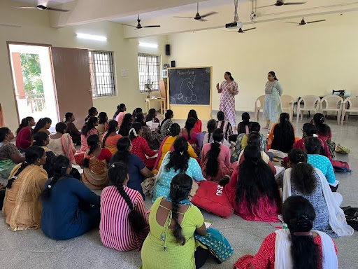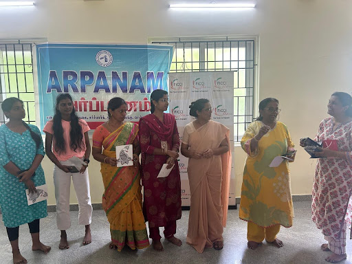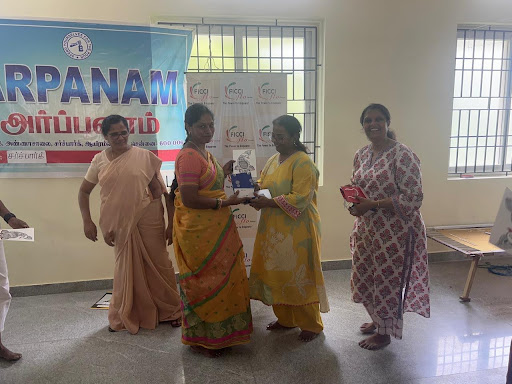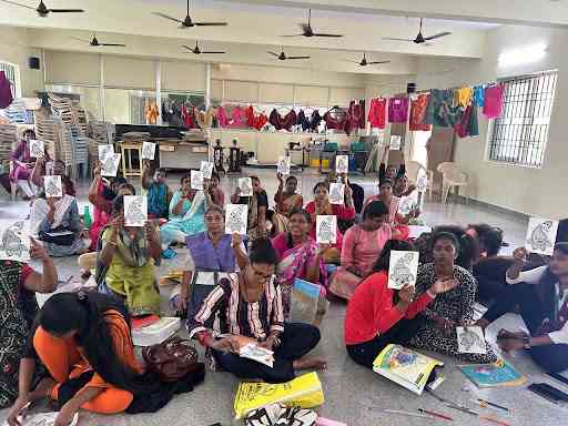 The first session, conducted on August 22nd, 2024, at Arpanam Trust’s Vocational Training Center in Thousand Lights, was facilitated by FLO Chennai member Ms. Preeti Ganeriwala. This session, attended by 50 women and 5 teachers, along with one session facilitator and one support member, aimed to diversify skills and promote cultural creative expression, mental well-being, and community building.