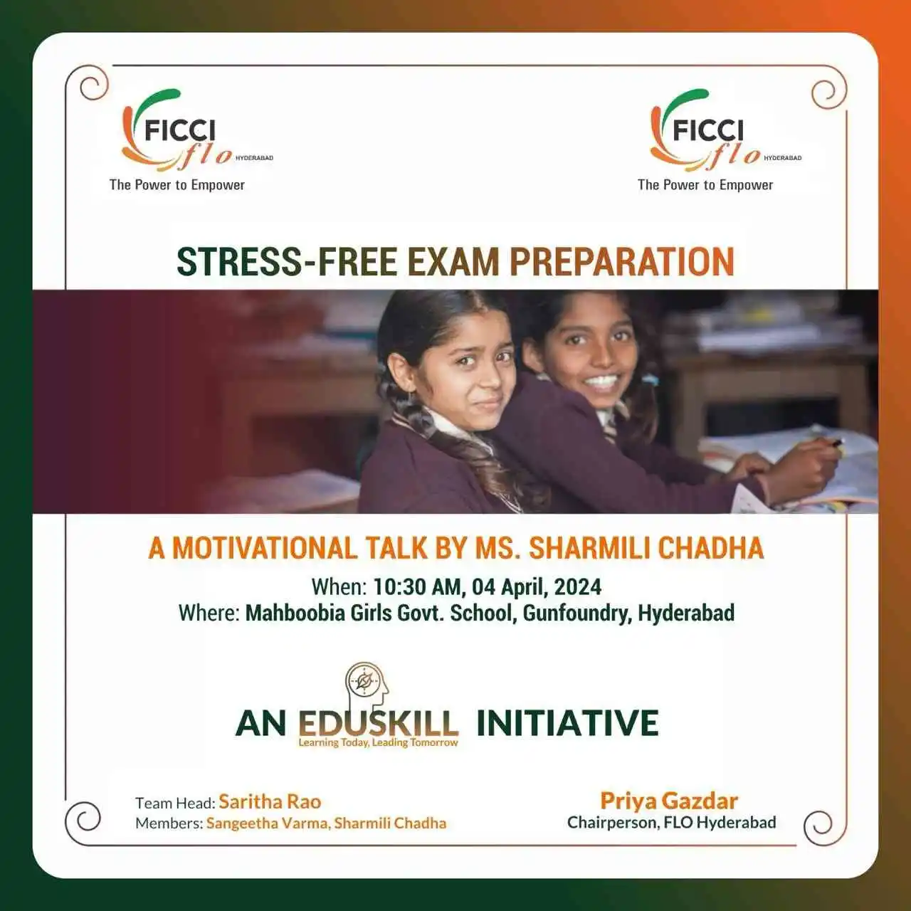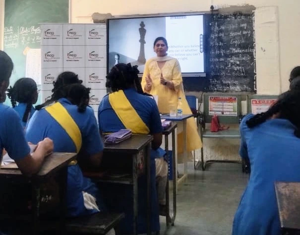 The EduSkill team at FLO Hyderabad organized a counseling session at Mahboobia Government Girls High School with the aim of educating underprivileged urban, semi-urban, and rural women and girls in areas of livelihood generation, health, and holistic development. The session specifically focused on providing exam preparation tips, promoting focused learning, and teaching stress-relief techniques to enable the girls to approach their exams with confidence.