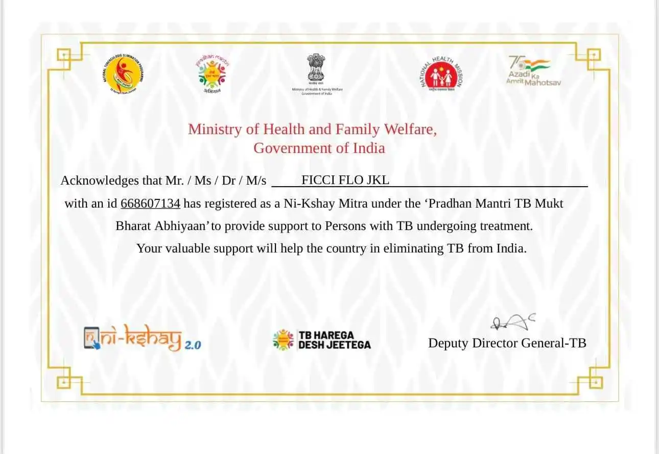 Additionally, a special certificate is awarded to FICCI FLO JKL for their significant contribution as a registered Ni-Kshay Mitra for TB eradication.