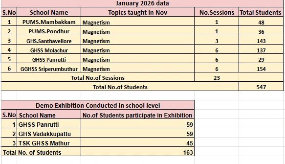 FLO Chennai, under the leadership of Niyati A. Mehta, in collaboration with the Samskriya Foundation, organized 23 interactive sessions on Magnetism for students across six schools in the Sriperambadhur region in January 2026. Designed for students of Grades 8 to 10, the sessions explained the practical applications of magnetism in everyday life, including its use in electric motors, generators, loudspeakers, medical equipment like MRI scanners, and basic electronic devices. Students shared positive feedback about the program on magnetism experiments, highlighting it as an engaging and insightful learning experience.