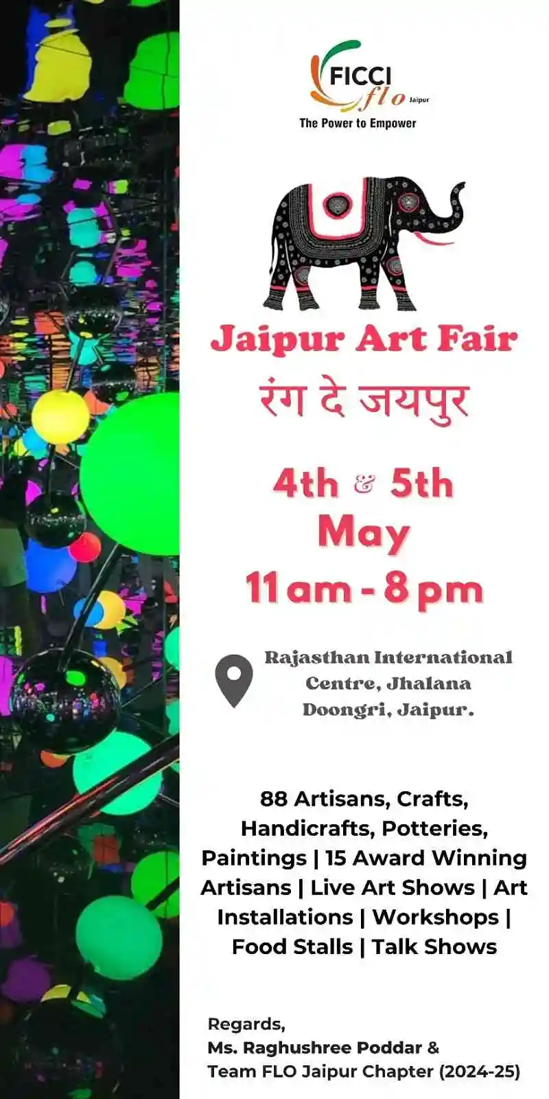 The Jaipur Art Fair, held recently on 04th and 05th May at RIC, Jaipur under the leadership of Ms. Raghushree Poddar, Chairperson FICCI FLO Jaipur Chapter 2024-25 was a vibrant celebration that highlighted the rich cultural heritage and artisanal craftsmanship of Rajasthan and beyond. This event not only served as a cultural extravaganza but also presented a significant business opportunity for the region, energizing tourism and fostering economic growth. Despite the challenge of condensing a year’s planning into just 15 days, the fair triumphed, showcasing tradition, art, and enterprise at its finest.