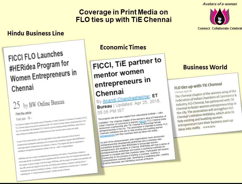 FICCI FLO Chennai, for the first time, have partnered with TiE Chennai to mentor existing and upcoming Women Entrepreneurs who wish to start up or scale up a business. They will also conduct a series of workshops on Entrepreneurship, Finance, Business Ideation, Strategy and Marketing. It is open to all members as well as non-members. This received extensive coverage in the Business media including Economic Times, Business Line, Business World, etc..