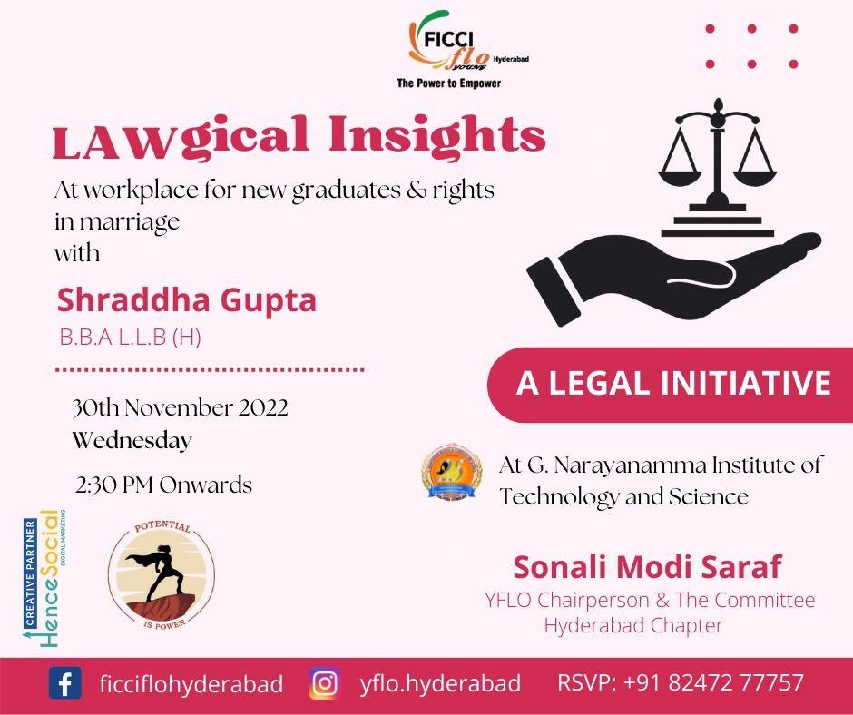 Delving into laws about women in the workplace and marriage rights for women, this session headed by the versatile and accomplished lawyer, Shraddha Gupta, enlightened the graduates and students at the G. Narayanamma Institute of Technology and Science, Women’s college in Hyderabad (GNITS) about their legal rights. The students participated with great enthusiasm. In an endeavor to spread legal awareness, this session was an eye-opener for the youth.