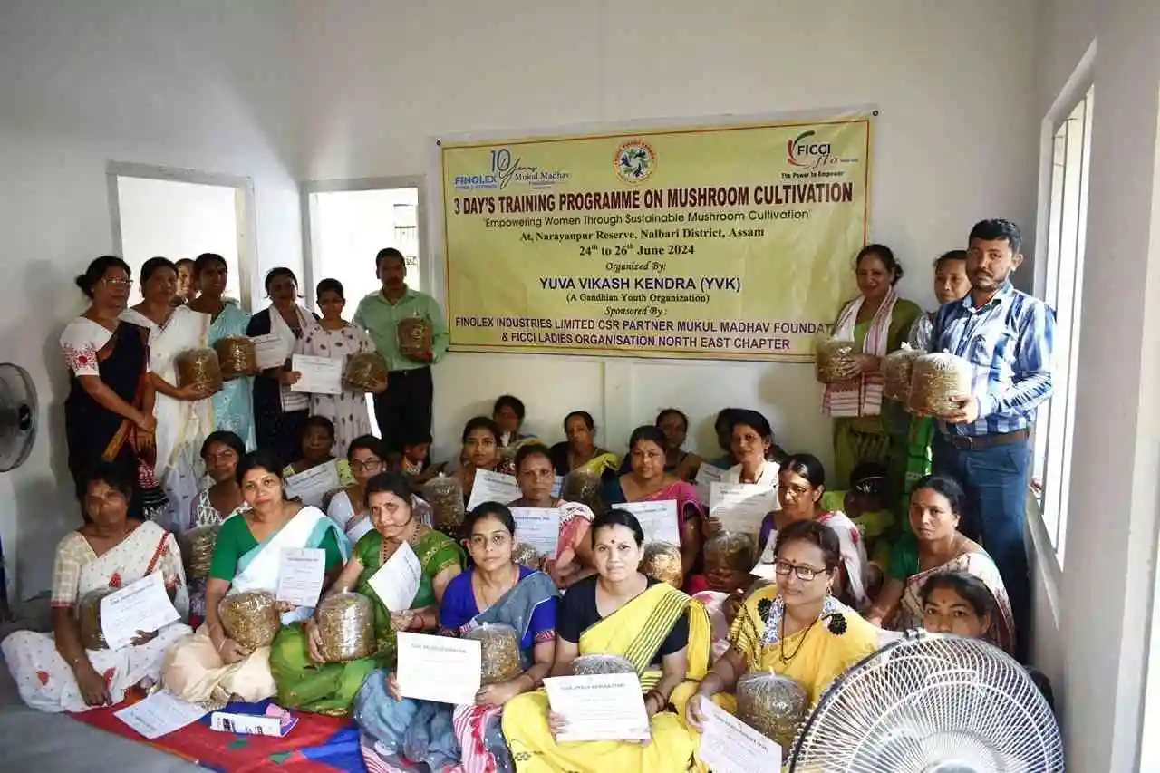 FICCI FLO North East, in collaboration with Yuva Vikash Kendra and Mukul Madhav Foundation, successfully concluded the first batch of a three-day Mushroom Cultivation Training Programme held in Narayanpur Reserve, Nalbari District, from June 24th to 26th, 2024.