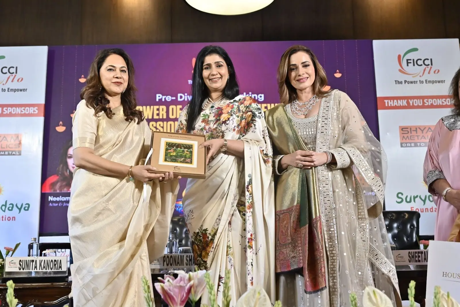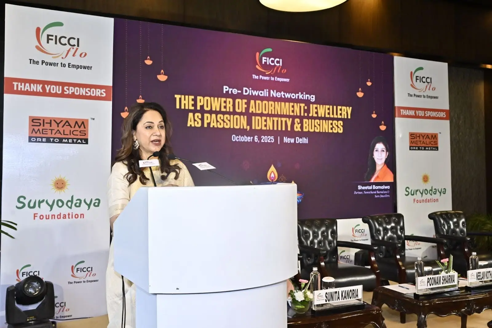 FICCI FLO, under the leadership of National President Ms. Poonam Sharma, hosted its Pre-Diwali Networking event, based on a unique theme, “The Power of Adornment: Jewellery as Passion, Identity & Business,” held at Desire Hall, Le Meridien, Windsor Place, Janpath, New Delhi. The event featured jewellery connoisseur and actor, Ms. Neelam Kothari Soni, with the host Ms Sheetal Bamalwa, partner at Nemichand Bamalwa & Sons Jewellers.
