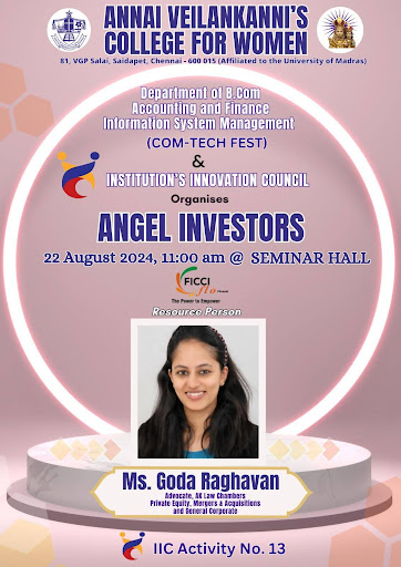 The session on Angel Investing, was conducted by Flo Chennai member, Ms Goda Raghavan, This session was attended by around 100 women, predominantly undergraduate students from the B.Com department of accounts and finance.