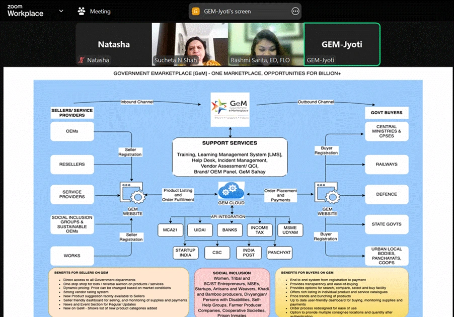 The session aimed to equip FLO senior members with the knowledge and tools to guide members and women entrepreneurs in enlisting in the Government’s e-marketplace (GeM). Mr. Anurag Awasthi, Chief Manager at GeM, also joined the session and provided an in-depth walkthrough of the GeM ecosystem and its latest developments. The session focused on integrating support services, including learning management systems, help desks, and vendor assessments, aimed at streamlining seller onboarding and order fulfillment.