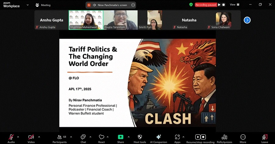 FICCI FLO, under the leadership of the 42nd National President, Ms. Poonam Sharma, hosted a thought-provoking virtual session titled “Tariff Politics: An Insight into the Emerging New Economic World Order” with Mr. Nirav Panchmatia, renowned Podcaster, Financial Literacy Coach, and Personal Finance Professional. Organised under the National Initiative on Academia, Industry & Government Collaboration, this session marked a significant step towards fostering constructive engagement among key stakeholders in today’s dynamic economic environment.