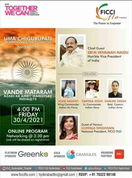 Taking inspiration from the words of the Honourable Prime Minister, FLO Hyderabad Chapter hosted its first Event Vande Mataram, celebrating 75 years of India’s freedom, in the form of Azadi Ka Amrit Mahotsav, India@75, to honour the Exceptional heroism of our Armed Forces, on April 30th 2021. It was an inspiring Virtual event that was attended by 150 participants. It was an honour to have the Vice President of India, Sri M. Venkaiah Naidu as the Chief Guest, Mrs Ujjwala Singhania, National President, FICCI FLO as the guest of honour. We also had Guest Speakers from 3 Armed Forces. – Lieutenant Commander Vartika Joshi from Navy, Captain Shalini Singh from Army and Wing Cdr Asha Vashist from AirForce.