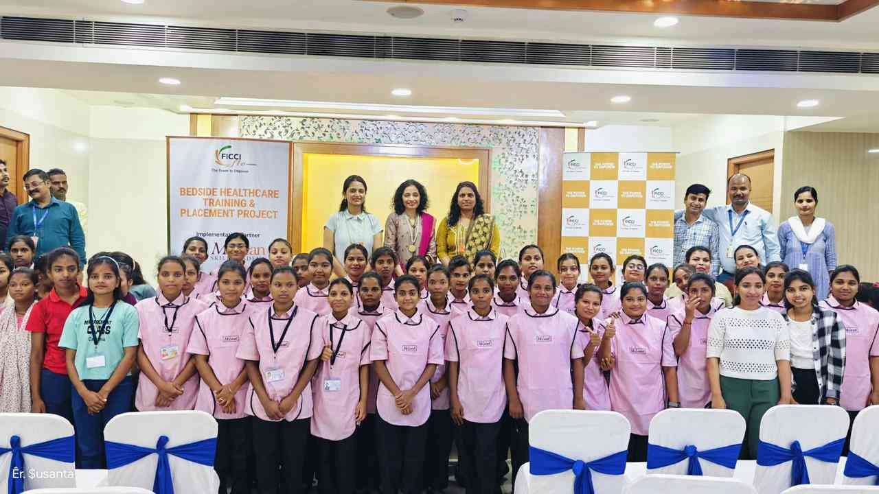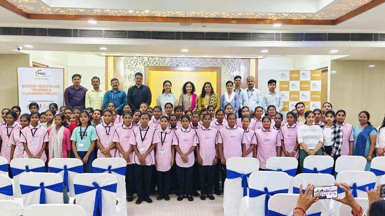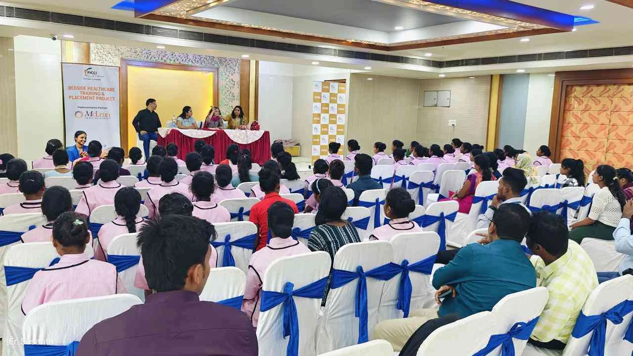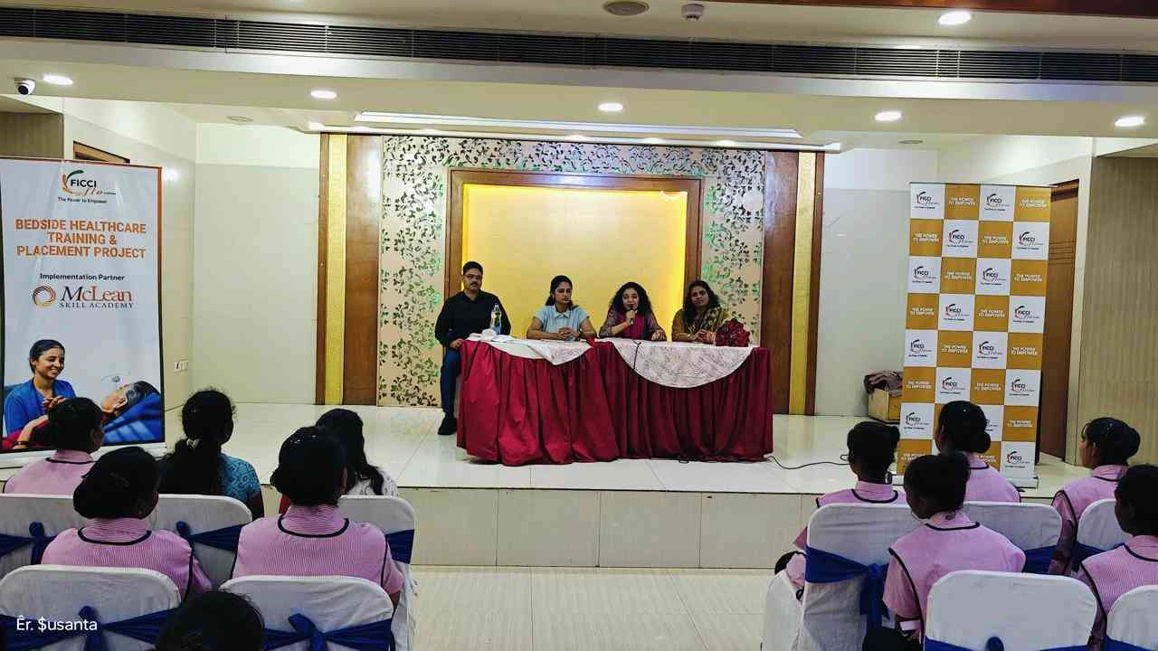 FLO Hyderabad launched the Bedside Healthcare Training and Placement project for Std. 10th/ 12th female students, from the underserved section of society. 65 young girls underwent rigorous training of 5 days by implementation partner McLean Skill Academy prior to being placed in leading hospitals. 100% placement guaranteed in AIG Hospitals, KIMS, and Rainbow Hospitals as bedside attendants to assist nurses. Priya Gazdar, Chairperson, initiated the session with a motivational address encouraging the trainees to build confidence, and self-love and stay on track for success. Hon. Secretary Sujitha Chityala highlighted the = importance of financial independence. Hon. Jt. Secretary Rashi Agarwal emphasised the need for an empathetic approach and building resilience for success in their line of work.