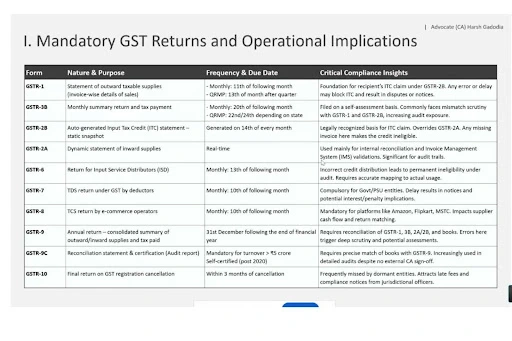- GST: Registration limits, return filing (GSTR-1, 3B), and composition scheme. Mandatory registration if turnover exceeds the threshold. Composition scheme options for small taxpayers.